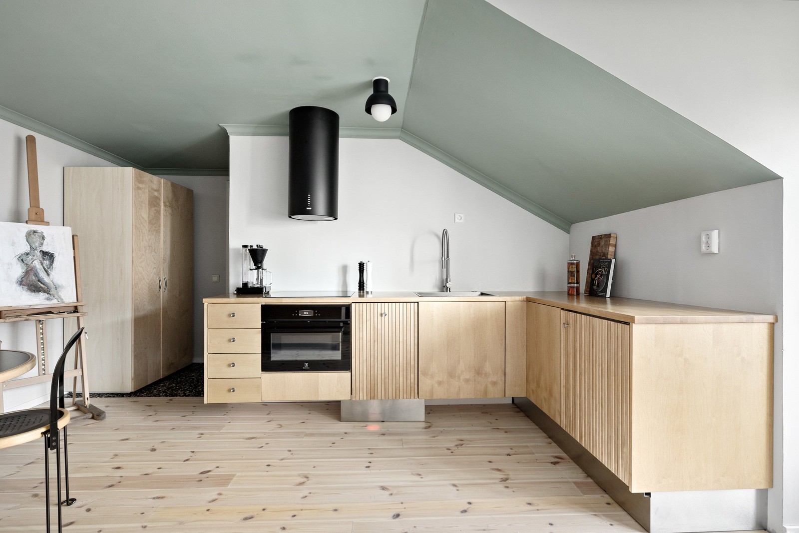 Allrummet erbjuder både utrymme för soffa, dubbelsäng och matgrupp. Takkupan med sina fönster ger ett mycket behagligt ljusinsläpp i lägenheten. Nuvarande ägare har praktiskt avskärmat ena hörnet som utgör sovdel med skenor i taket och en platsbyggd rumsavdelare med förvaring. Här finns dessutom ett påkostat kök med ljusa luckor och bänkskiva i hårdvaxoljad björk. Köket är utrustat med diskmaskin, induktionshäll, diskho, bänkkyl med frysfack, samt en kombinerad ugn och mikro. Golvet är ljust massivt furugolv som har hårdvaxoljats med ett lätt gulhetsreglerande medel för att bevara den ljusa tonen målade väggar har du i detta ljusa allrum.