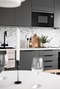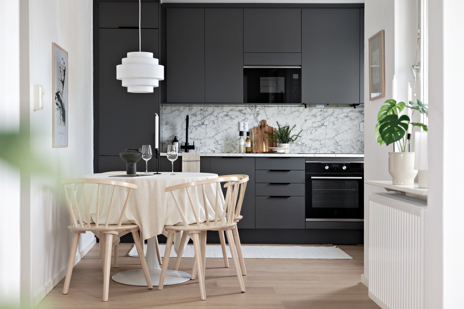 Stilrent kök renoverat 2025 med grå köksinredning och ljusa bänkskivor i laminat och utrymme för matplats i anslutning. Köket är utrustat med kyl/frys, integrerad diskmaskin, ugn, spishäll, fläkt och micro. Fint ljusinsläpp från fönster.