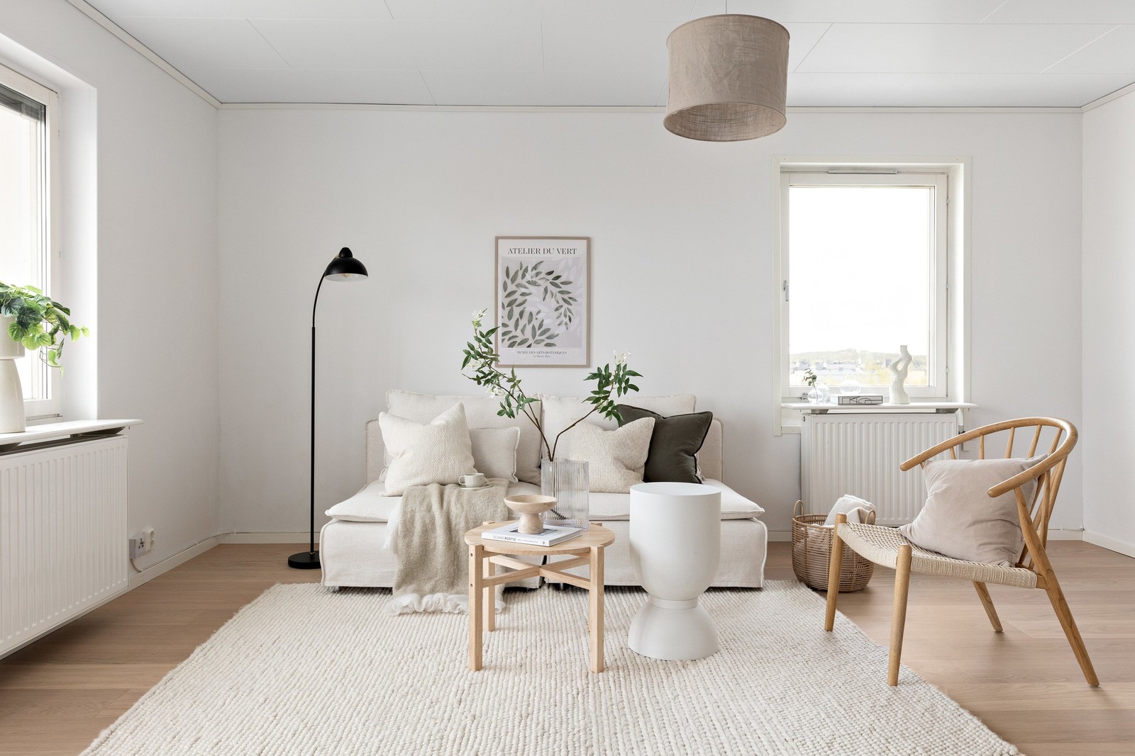 Hela lägenheten har ljusa enhetliga golv och ljust målade väggar.