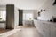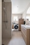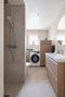 Helkaklat och stilrent badrum renoverat -25 med smakfulla materialval som ger en exklusiv känsla och ett modernt intryck. Här har man flertalet fina och platsbyggda detaljer så som en infälld hylla i duschen med inbyggd belysning, platsbyggd förvaring kring tvättmaskinen vilket ger en praktisk avlasningsyta. Utöver det består utrustningen av en wc samt handfat med kommod.