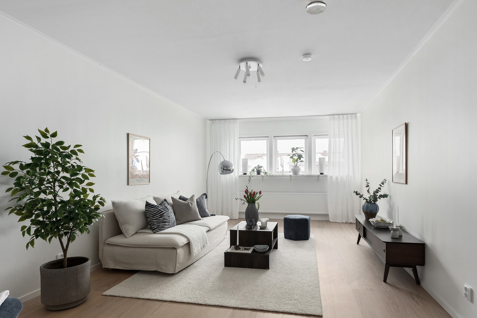 Här välkomnas du av en bred och luftig hall med plats för både hatthylla och annat möblemang om så önskas. På din högra sida finns det smakfullt inredda badrummet med kakel och klinker samt tvättmaskin. Lägenhetens hjärta är det fantastiska köket som är i större slaget med gott om skåp och arbetsyta samt matplats med utrymme för större matbord. Vardagsrummet är också det luftigt och inrymmer både stor soffa och annat möblemang. De två sovrummen har mysigt snedtak och garderober för klädförvaring. Lägenheten är högt belägen på 6:e våningen med hiss och har fönster i två väderstreck vilket ger ett fint ljusflöde i lägenheten. Förråd finns att disponera på första våningen. På sommaren kan du nyttja föreningens innergård med möblerad uteplats och grillmöjligheter. I källaren finns gott om garageplatser som fördelas enligt separat kö.