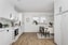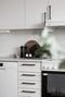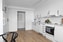 Väl tilltaget och trivsamt kök som erbjuder ett både praktiskt och snyggt utförande. Här finns väldigt gott om förvaring i köksskåp och skafferi samt ordentligt med arbetsyta. Luckorna är vitmålade i november 2025 och här finns vitt stänkskydd i kakelliknande utförande ovan ljusa melerade bänkskivor i laminat. Matplats med utrymme för köksbord av större modell. Tjusigt golv och vita målade väggar.