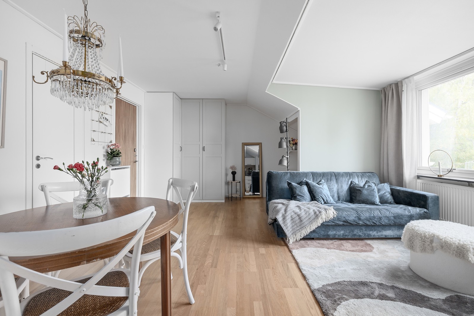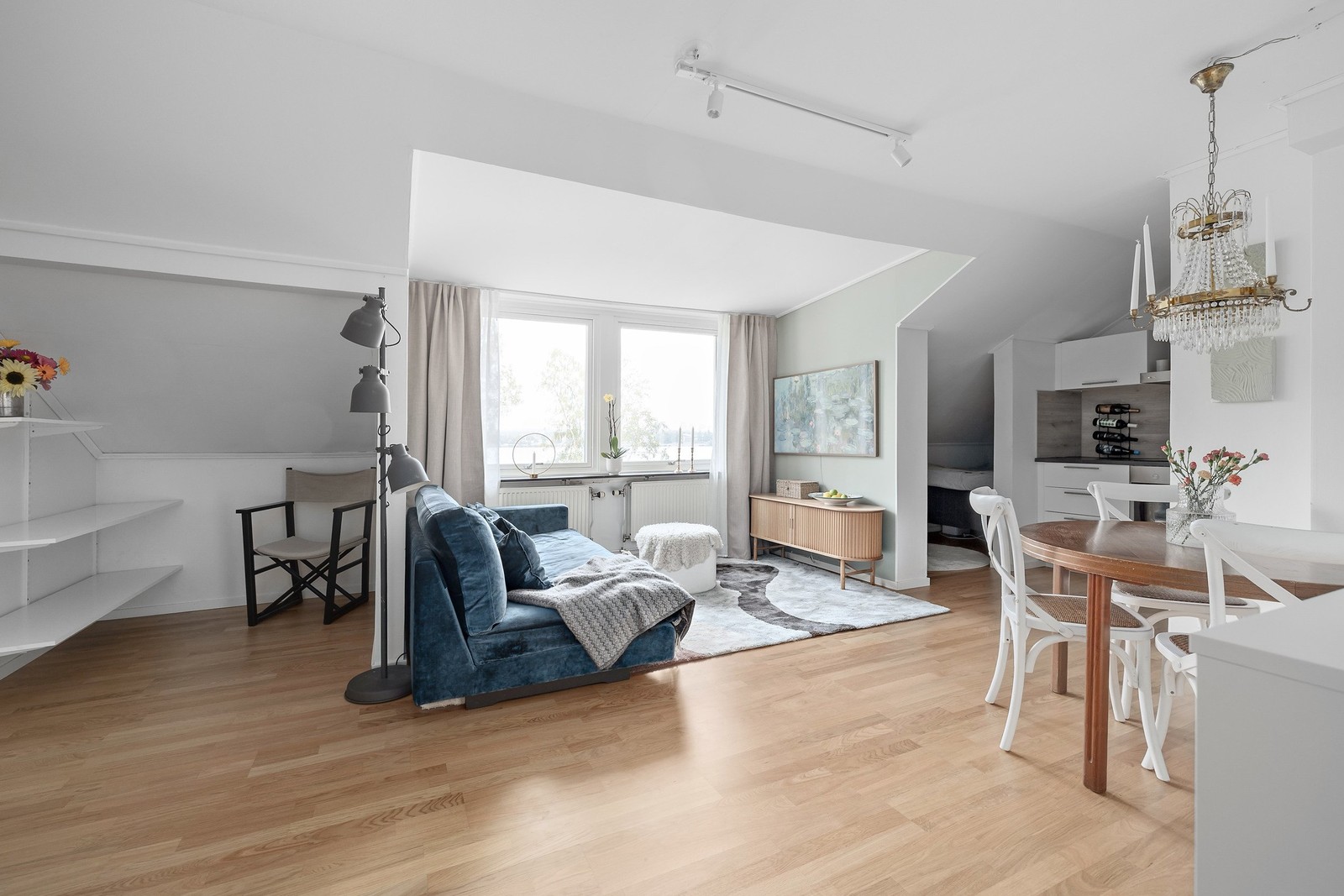 Rymligt och lättmöblerat allrum med gott om plats för både soffa och matplats. Från rummet möts du av den fina utsikten över vattnet genom stora fönster som släpper in rikligt med ljus. Här finns även en smart sovalkov som skapar en naturlig avskildhet. I sovalkoven ryms säng om ca 140 cm. Tillsammans med en avdelning på andra änden av rummet som går att nyttja som läshörna eller göra om till praktiskt förvaringsutrymme.