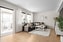 Välplanerat vardagsrum med plats för soffgrupp. Stora fina fönsterpartier. Ljusa väggar samt mörk akustikpanel på en vägg & parkettgolv. Invid kök och vardagsrum finns bostadens inglasade balkong med heltäckningsmatta.