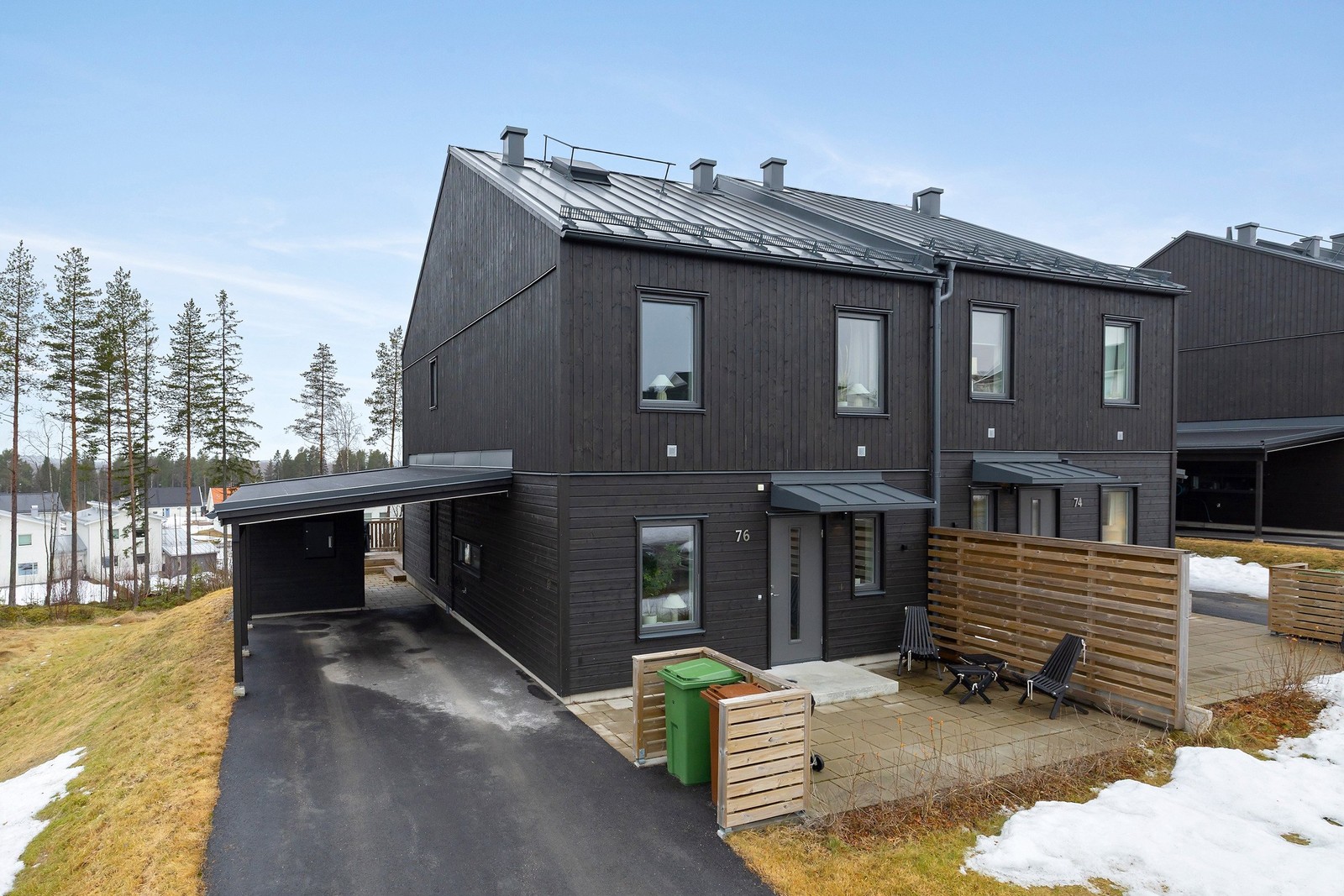 Varje lägenhet har tillgång till ett kallförråd på ca 4 kvm, som ligger innanför respektive carportplats. Varje bostadsrättsinnehavare ansvarar själv för skottning och skötsel av trädgård intill sin bostadsrätt.