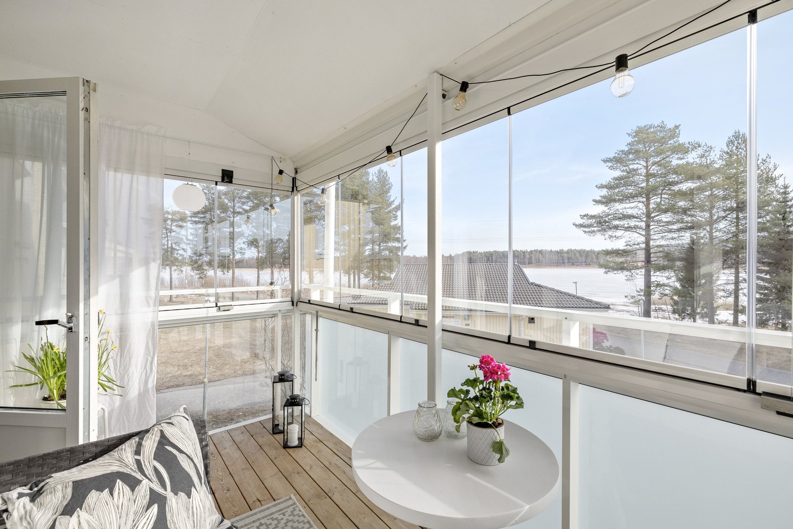 Denna bostad har ett badrum som är renoverat 2025 med snygga val och praktiskt utrustat med tvättmaskin. Köket har ljus inredning och inrymmer gott om förvaringsmöjligheter bakom lådor och skåp. Vidare återfinns det luftiga vardagsrummet med plats för både soffa och annat. Här nås även den inglasade balkongen med vacker utsikt ned mot vattnet. Bostadens sovrum har en lugn väggfärg och inrymmer dubbelsäng. Praktisk förvaring i både hall och klädkammare. Genomgående samma golv vilket ger ett enhetligt intryck, samt väggar målade i lugna kulörer.