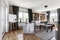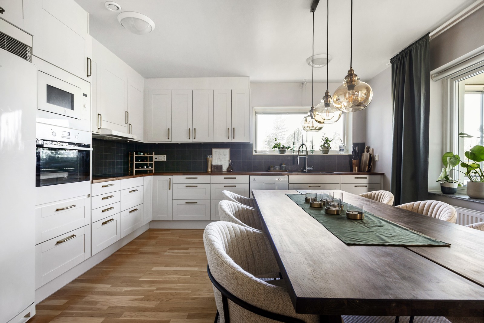 Stilrent kök med vita luckor, rostfria handtag och kakel i mörkgrå ton med bänkskivor i trä. Rymlig matplats som rymmer en större matgrupp. Köket är utrustat med helstor kyl och frys, diskmaskin, inbyggd ugn och mikrovågsugn, spis samt fläkt. Halvöppen planlösning mot vardagsrummet. Parkettgolv och ljusa väggar.
