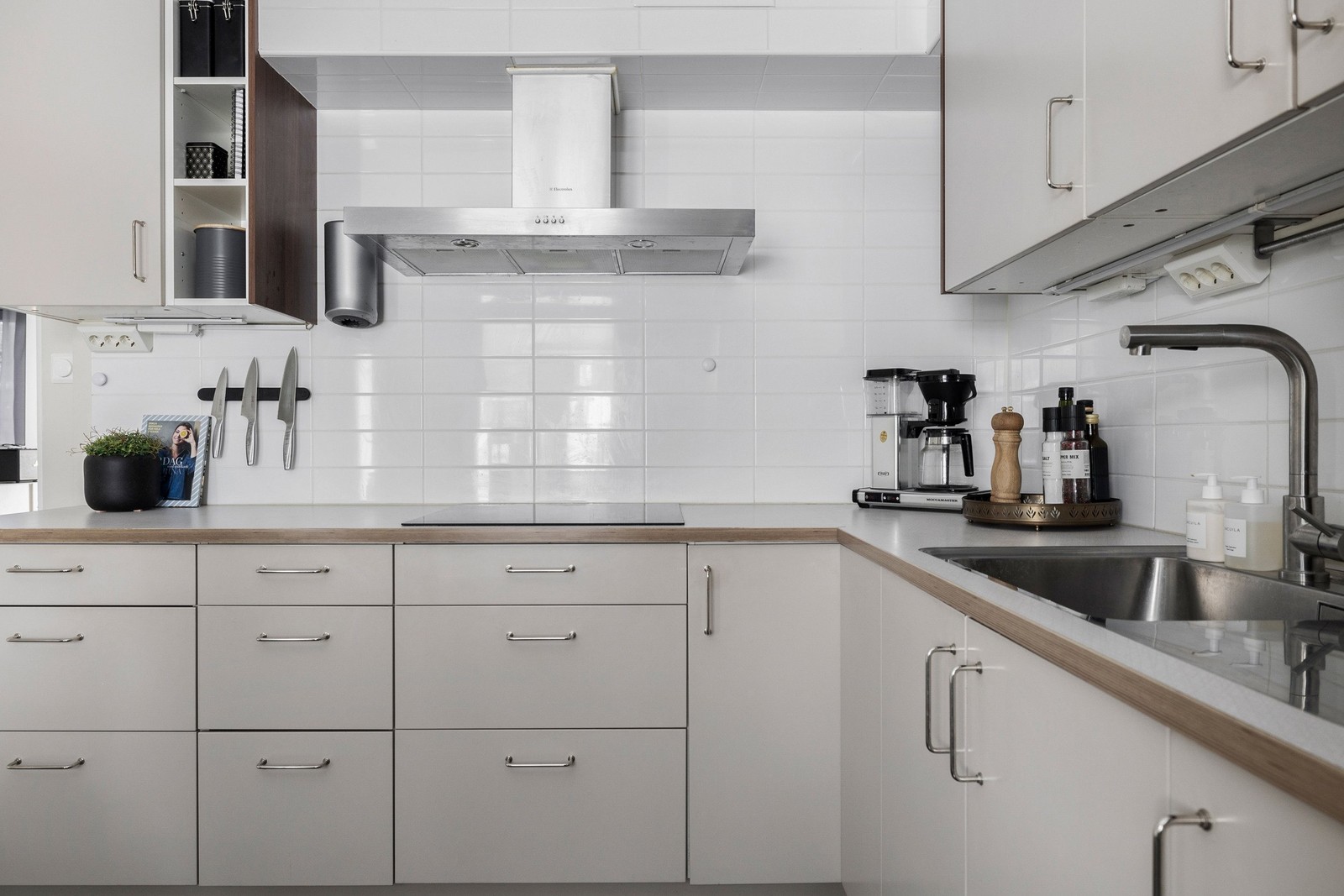 Stilrent kök med tidlös inredning så som ljusa släta luckor, bänkskiva i laminat och vitvaror i form av fullstor kyl och frys, induktionshäll, spisfläkt, ugn och micro i bekväm arbetshöjd samt diskmaskin. Köket har vinylgolv och målade väggar.