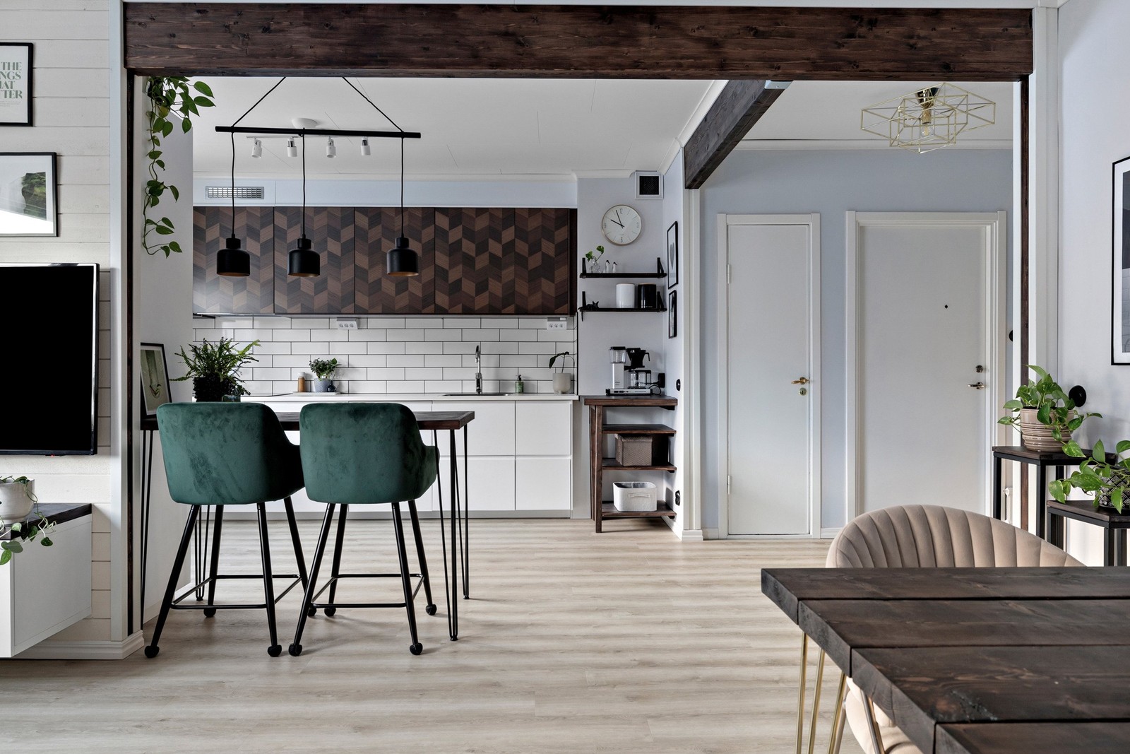 Stilrent och väl utformat kök -23 med vita luckor i tidlös design, kombinerat med överskåp med mönstrad träimitation som tillför värme och karaktär. Köket har bra arbetsytor och är öppet mot vardagsrummet, vilket skapar en social och inbjudande atmosfär. Utöver det har köket en fin maskinell utrustning bestående av inbyggd kyl/frys, diskmaskin, häll, fläkt tillsammans med både ugn och mikro installerade i bekväm arbetshöjd. Alla vitvaror byttes ut vid renoveringen -23.