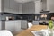 Snyggt kök från Epoq (-21) med grå släta luckor. Här finns bra arbetsytor och förvaringsmöjligheter. Den maskinella utrustningen består av diskmaskin, kombinerad kyl/frys, spis och fläkt. Intill köket finns plats för matgrupp.