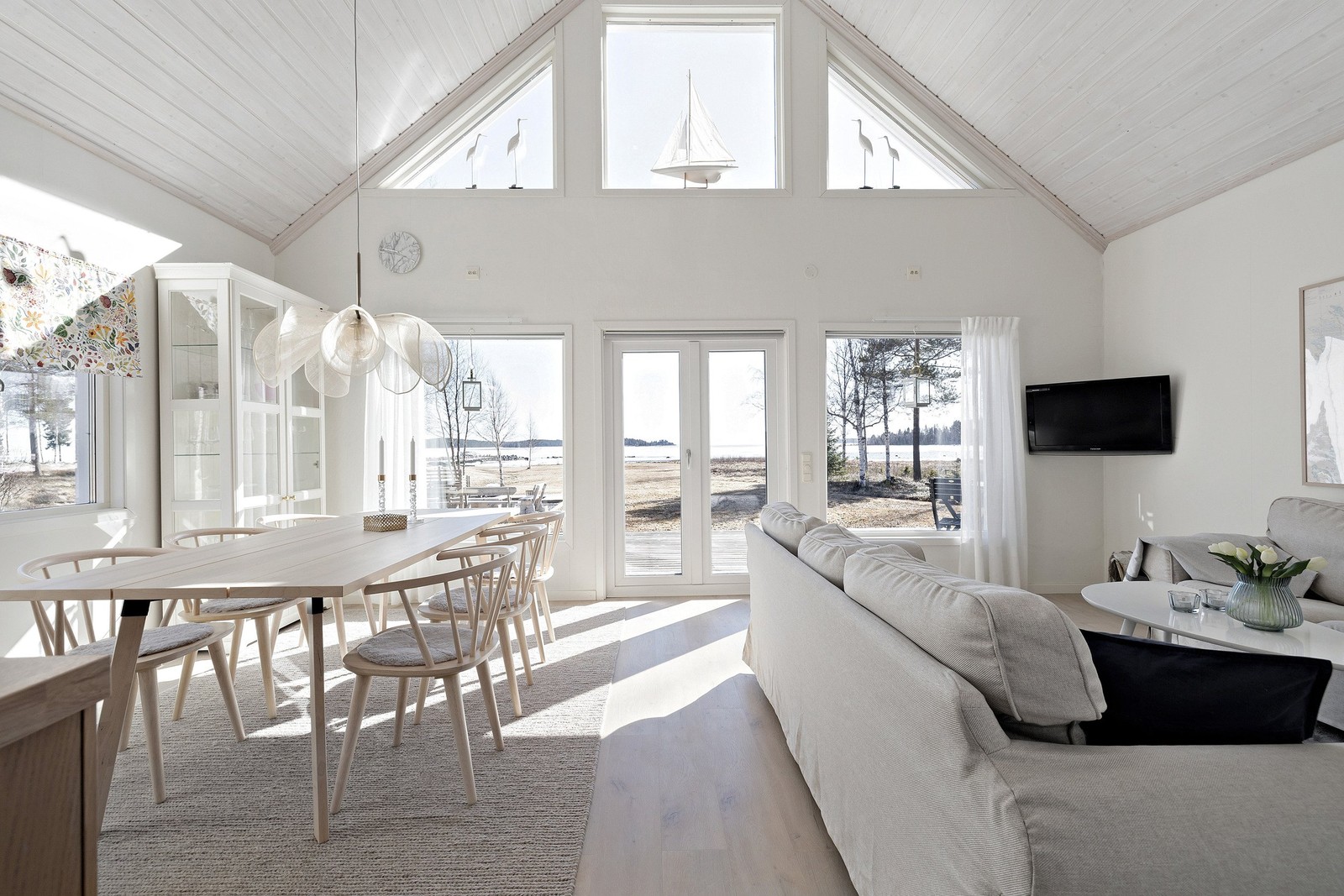 Allrum och matplats ligger i en öppen och social planlösning där stora fönsterpartier låter dagsljuset flöda in och skapar en fin kontakt med omgivningen och vattnet. Ljusa golv, målade väggar och golvvärme i stora delar av huset bidrar till en varm och inbjudande atmosfär, oavsett säsong.