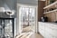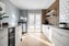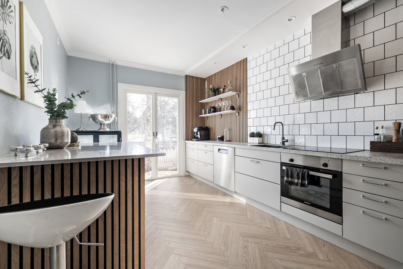 Stilfullt kök i sobra färger. Här finns gott om förvaring via skåp samt bra med bänkytor. Bänkskivan är i laminat på köksdelen och stenkomposit på kökshalvön. Matchande stenkomposit återfinns även i hyllorna ovanför köket, vilket ger en sammanhängande känsla. Den maskinella utrustningen består av kyl/frys, mikrovågsugn, spis (-26), fläkt, diskmaskin (-23) samt en vinkyl (-26) infälld i kökshalvön. Även här är det vinylgolv och målade väggar. Från köket återfinns dubbeldörrar som leder ut till baksidan av huset, här finns fina gräsytor.