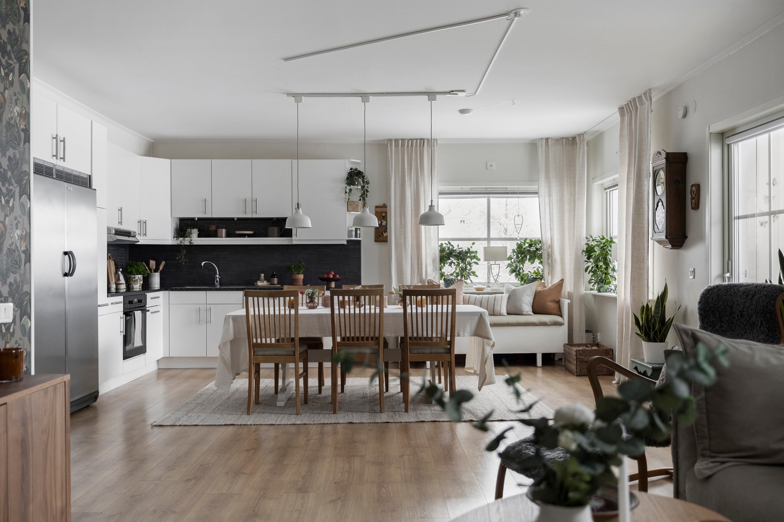 Kök och vardagsrum samspelar i en öppen och social planlösning som skapar generösa sällskapsytor. Det stilrena köket är utrustat med vit köksinredning, gott om förvaringsutrymmen. I anslutning finns en naturlig matplats med plats för ett större matbord. Det ljusa vardagsrummet präglas av ett härligt ljusinsläpp från fönster i två väderstreck och rymmer både soffgrupp och övrigt möblemang. Den eldningsbara öppna spisen är en vacker detalj och bidrar samtidigt till extra trivsel under årets kallare månader. Från vardagsrummet nås balkongen som är delvis öppen och delvis inglasad, vilket möjliggör nyttjande större delar av året.