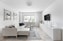 Tilltaget sovrum stiliga garderober på sidorna av sängen och ovan sängen är vägghängda överskåp placerade för extra förvaring. Rummet har samma fina golv som övriga bostaden och tapetserade väggar i mörkblå.