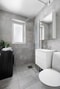 Det renoverade badrummet är helkaklat i stilrent utförande (2023) med golvvärme och utrustat med tvättmaskin för extra bekvämlighet. Därutöver finns en separat toalett praktiskt placerad intill hallen.