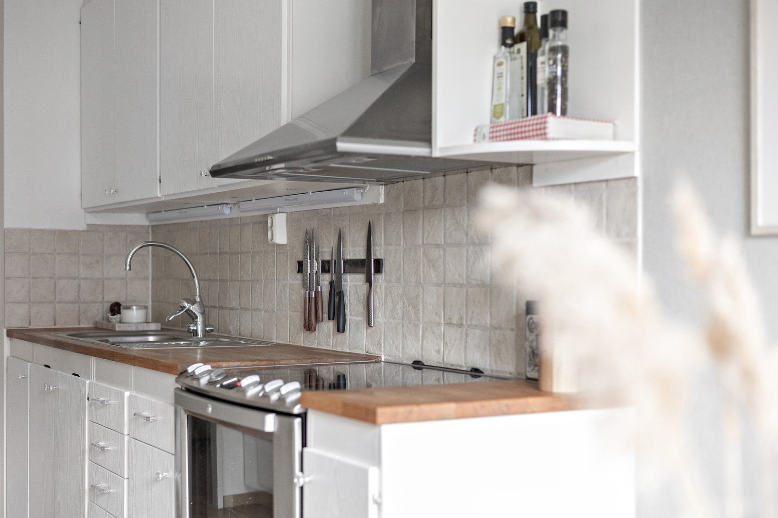 Trevligt kök med fint ljusinsläpp och goda förvaringsmöjligheter, plats för matgrupp för den som önskar. Utrustat med kombinerad kyl och frys, spishäll, fläkt, ugn. Ljusa väggar och fint laminatgolv.