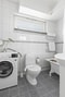 Helkaklat badrum bekvämt utrustat med tvättmaskin, dusch, badkar, wc-stol, kommod, vägghängt spegelskåp och handfat.