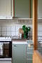 Charmigt kök med luckor i grön kulör och beslag i trä. Bänkskiva i rostfritt stål vid diskbänk och träskiva på andra sidan. Vitt kakel med mörk fog ger snygg kontrast.