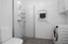 Badrummet är stilrent inrett med helkaklade väggar och utrustat med wc, kommod med förvaring, spegel, handdukstork, badrumsskåp samt dusch med glasväggar. Här finns även en kombinerad tvätt- och torkmaskin som gör vardagen bekväm.
