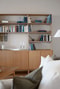 Vardagsrummet ligger i social anslutning och har ett stort fönsterparti samt utgång till balkongen i västerläge. Härifrån blir kontakten med naturen tydlig, där årstidernas skiftningar i Tinnerös eklandskap sätter prägel på upplevelsen av rummet.