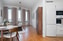 Stilrent kök med vita luckor, svart granit bänkskiva och vitt kakel som stänkskydd. Utrustat med köksfläkt, ugn, induktionshäll, diskmaskin samt kyl och frys. Bra arbetsytor och förvaring.