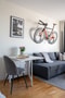 Vardagsrummet erbjuder möblering för både säng, soffa och ett litet matbord, nuvarande ägare har ett fällbart, vilket får plats uppfällt vid besök. Sovdelen av vardagsrummet kan anpassas efter behov, tex avskärmning med vägg i industriglas som behåller ljuset från fönsterpartiet. Väggen bakom tv är försedd med trendig akustikpanel som ger karaktär till rummets annars ljusa väggar.