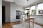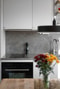 Modernt kök från Ikea med luckor i ljusgrå kulör och beslag i rostfritt stål. Bänkskiva och stänkskydd i stilren portugisisk kalksten. Maskinell utrustning i form av diskmaskin, kombinerad kyl och frys samt ugn och mikrovågsugn. Vitvaror i rostfritt stål. Nuvarande ägare har valt att platsbyggda extra skåp invid fönstret i köket för mer förvaring. Köket har plats för mindre matgrupp. Fiskbensparkett och ljust målade väggar.