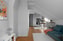Snedtaket i bostaden skapar en mysig och hemtrevlig känsla. Plats finns för både skrivbord och soffmöbler. Sovalkov inramad med vägg i industriglas, plats för dubbelsäng. Fiskbensparkett och ljust målade väggar samt vitmålad skorstensstock.