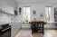 Köket integreras öppet mot allrummet och pryds av en bänkskiva, vitt kakel ovanför arbetsytan och gråa skåpluckor. Köket är utrustat med vitvaror, inklusive induktionshäll, varmluftsugn, fläkt, mikrovågsugn och kyl/frys.