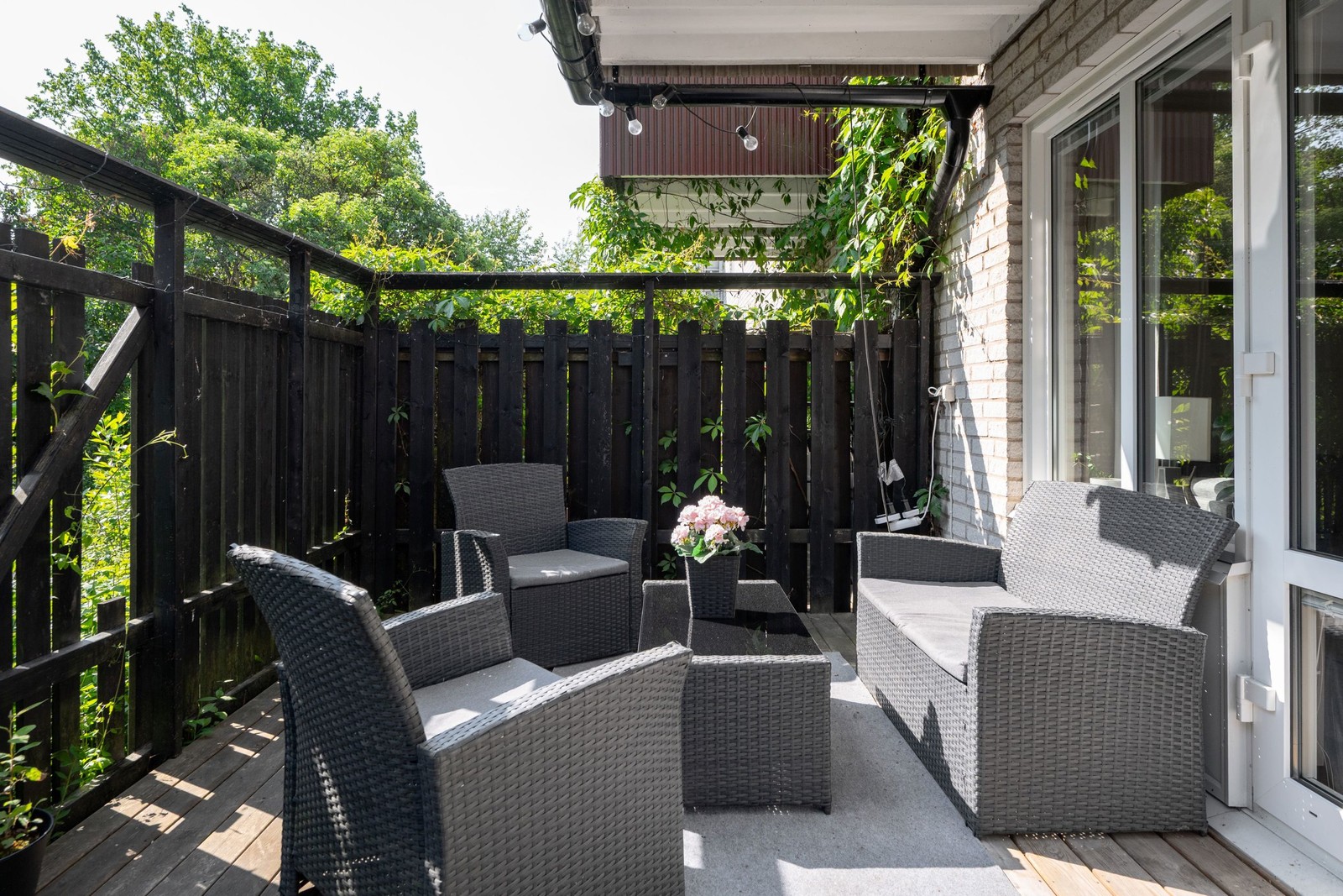 Vardagsrummet har ett fint ljusinsläpp från stora fönsterpartier, vilket ger en ljus och öppen känsla. Rummet rymmer både soffgrupp och matbord, och har en utgång till en trevlig uteplats med morgonsol.