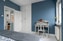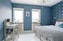Rymligt sovrum med generös förvaring samt plats för en dubbelsäng och tillhörande sängbord. Här finns dessutom gott om utrymme för ett skrivbord eller annan praktisk möbel. Rummet har gott om ljusinsläpp och väggar i en blå nyans, med en kombination av målade och tapetserade ytor.