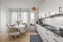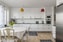 Stilfullt kök från Marbodal med rymlig plats för matgrupp intill köksfönstren. Vita köksluckor, mörk bänkskiva i laminat samt stora vita kakelplattor som stänkskydd. Utrustningen består av rostfri kyl och frys, ugn och micro, diskmaskin, induktionshäll och fläkt. Vitmålade väggar och golv i vitlaserad ask.