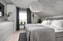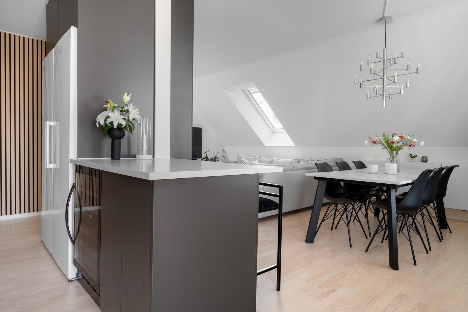 Bostaden präglas av en stilren design med ljusa ekparkettgolv och målade väggar i ombonade kulörer som skapar en inbjudande atmosfär. I passagen mellan kök och vardagsrum finns en elegant akustikpanel som förbättrar ljudmiljön och adderar en modern touch. Köket är både praktiskt och estetiskt tilltalande, med gott om arbetsytor, förvaringsskåp och en köksö som rymmer en integrerad vinkyl. Här finns även fullhöjd kyl och frys, induktionsspis, fläkt, diskmaskin och mikro, allt för att göra matlagningen till en fröjd. De två sovrummen har smarta garderobslösningar och hallen erbjuder extra förvaring bakom skjutdörrar.