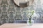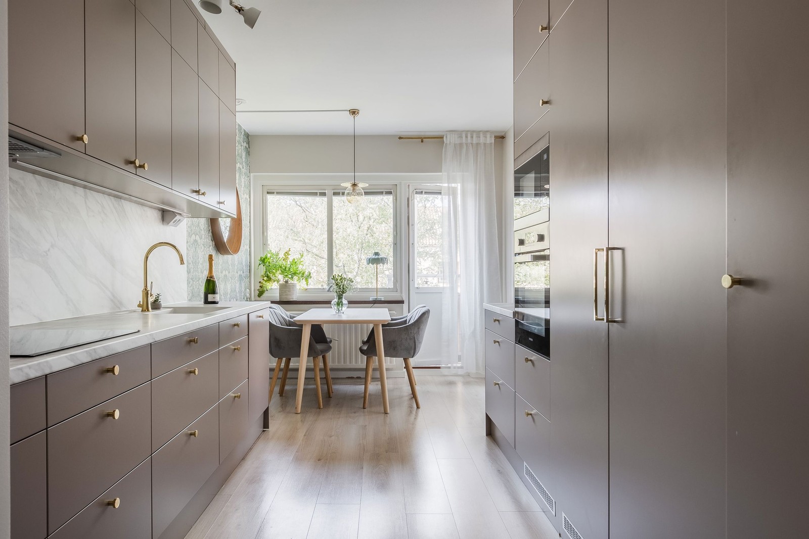 Köket är stilfullt designat med en bänkskiva, skåpluckor i gråbrun nyans och vitgrå marmor ovanför arbetsytan. Den maskinella utrustningen inkluderar spishäll, varmluftsugn, fläkt, diskmaskin samt kyl och frys. Det finns även utrymme för en matplats. Golvet är i parkett, och väggarna pryds av en blommig grön tapet.