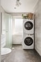 Modernt badrum med våtrumsmatta på golv och väggar. Utrustningen inkluderar golvvärme, spegel, kommod, WC, tvättmaskin, torktumlare, glasade duschväggar och dusch.