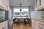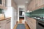 I det rymliga köket finns fullhöjds- kyl och frys, diskmaskin, spis, fläkt, ugn och integrerad micro. Ljusa köksluckor och bra beredningsytor på bänkskiva och diskbänk, med kakel ovan i grön ton. Matplats vid fönstret.