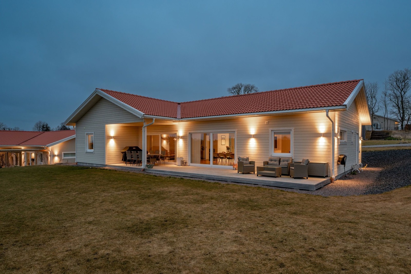 Huset erbjuder en bred grusad uppfart med gott om plats för flera bilar. På framsidan finns en mindre uteplats med trädäck, medan baksidan imponerar med en stor uteplats i västerläge där du kan njuta av kvällssolen och den rofyllda utsikten mot Svartån. Läget är perfekt för dig som söker ett lugnt och avskilt område, samtidigt som du har gott om sociala ytor både inne och ute.