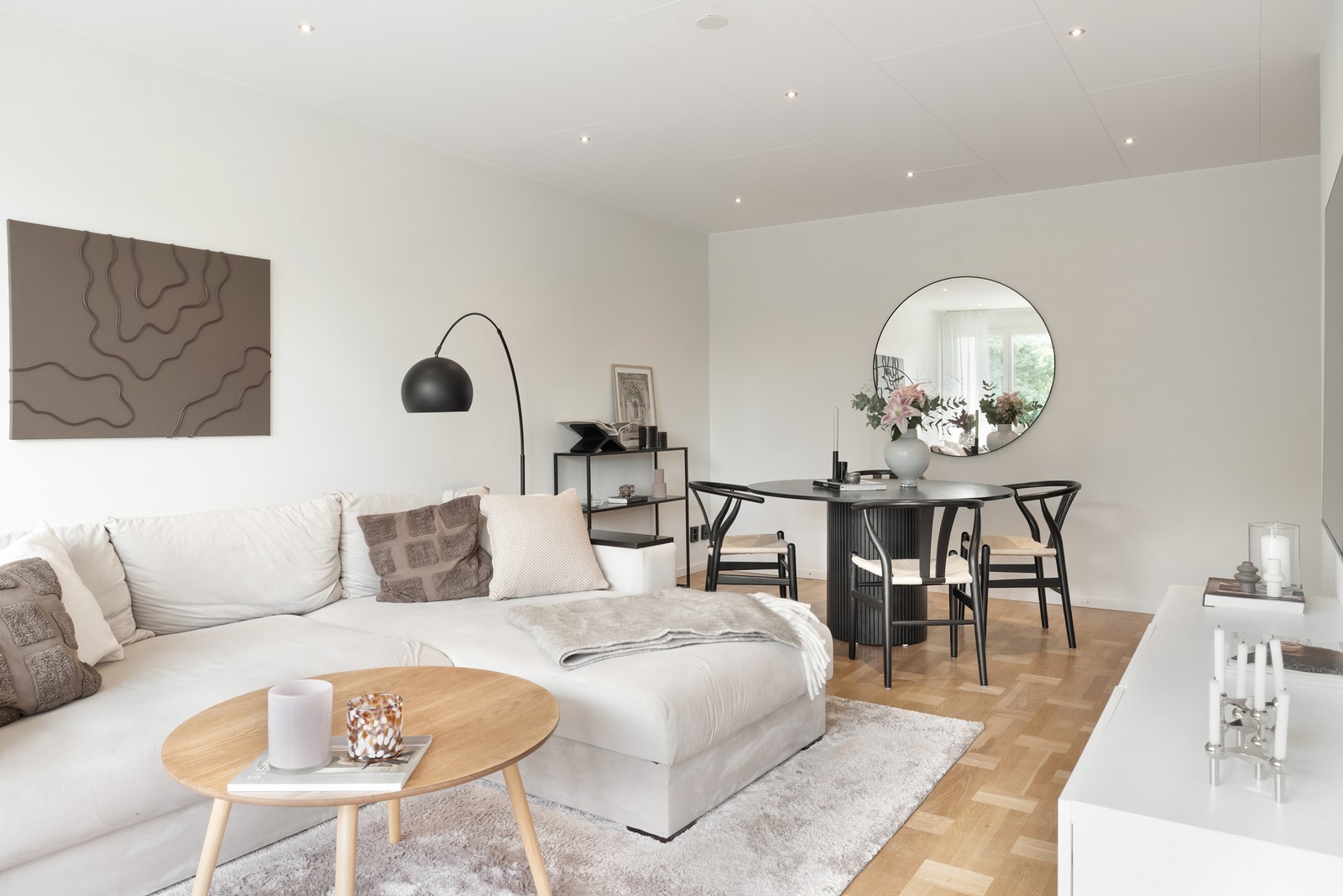 Från hallen till höger har vi det trevliga vardagsrummet. Ljust och rymligt, med plats för både större soffgrupp samt ett matbordsmöblemang. Golvet pryds av ett parkett och väggarna är vita, dimmbara spotlights i tak. Här har du också altandörren som tar dig ut till en mysig balkong att kunna njuta av under varmare sommardagar.