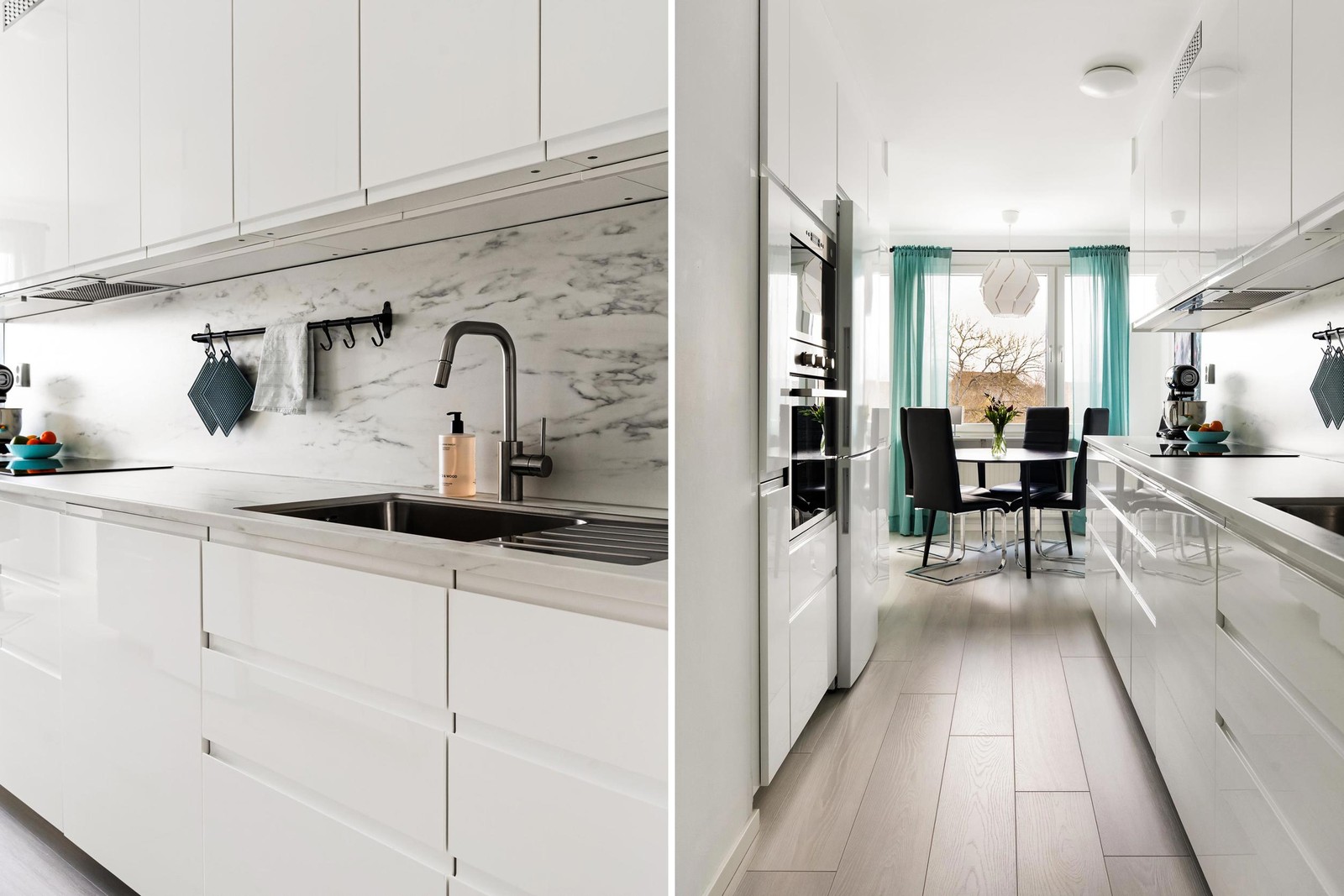 Snyggt renoverat kök från år 2023! Högblank från IKEA med snygg ljus bänkskiva. Utrustat med integrerad diskmaskin, kombinerad kyl/frys, induktionshäll, ugn samt micro. Längst in i köket ut mot fönsterpartiet som vetter ut mot baksidan med Rönne å i närheten har man även en matplats. Ljusa väggar och laminat på golv.