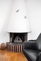 Stort vardagsrum med fiskbensparkett, vacker eldstad och utgång till balkong.