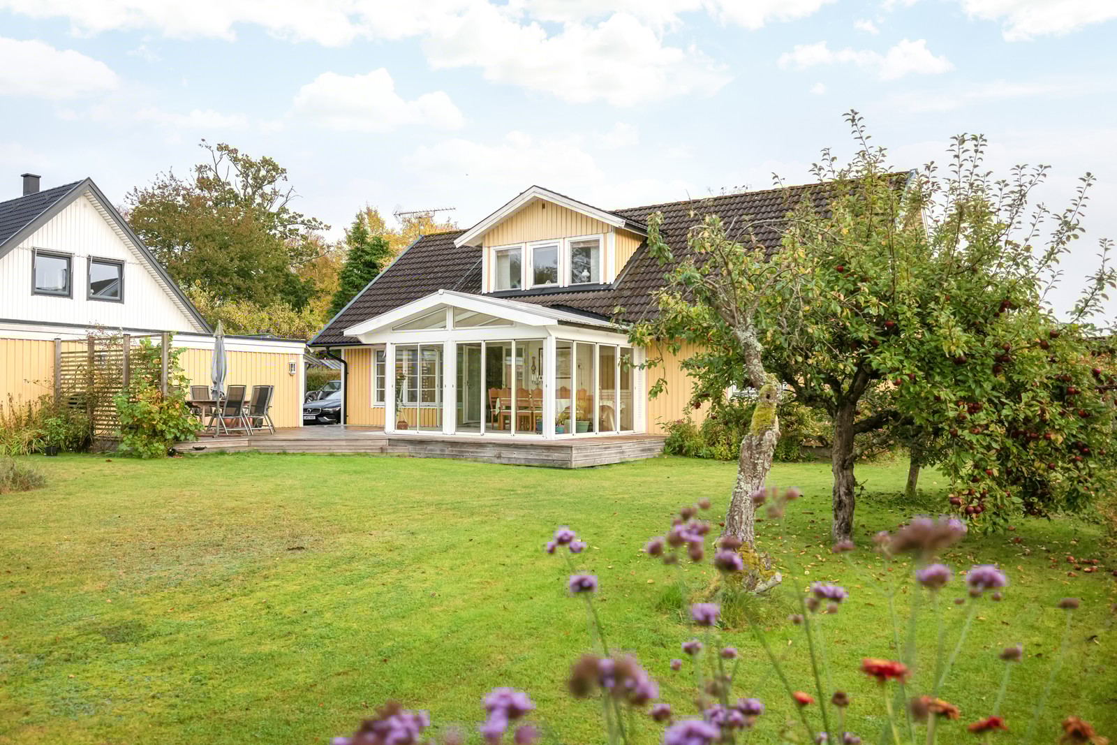 Bostaden har en flexibel planlösning med möjlighet till upp till fem sovrum, vilket ger gott om utrymme för både familjeliv, hemarbete och gäster. Det inglasade uterummet förlänger säsongen och fungerar som en extra yta större delen av året.