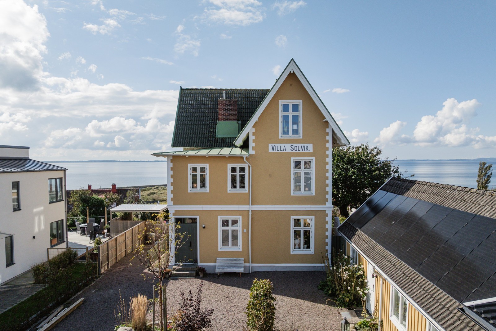 Den högresta villan ligger på den fridfulla Hotellvägen som löper längs den höga branten ovanför Skäldervikens gamla hamn. Huset byggdes 1906 i tidstypisk badortsstil med gulrappad fasad, vita gesims, dekorativa knutar, spetsiga tegeltak, djupa taksprång samt fönsterpartier med överfönster. Ut mot havet på villans baksida reser sig ett rundat burspråk i tre plan. Det bidrar till det charmiga och lekfulla formspråket som nästan för tankarna till Tove Janssons Mumindalen. Villan är nu tillbyggd och exklusivt totalrenoverad med bland annat nya fönster, golv, badrum och nytt kök. En väl avvägd följsamhet mot ursprungsmiljön – med bland annat bevarade spegeldörrar och detaljskurna listverk – möter vår tids design, bekvämlighet och platsbyggda förvaringslösningar. Den vackra bostaden är till stor del präglad av det höga, fria och smått sensationella läget med panoramautsikt över Skälderviken. Sol, himmel och hav är ständigt närvarande på alla tre planen. Den tillbyggda matsalen – med höga och närmast heltäckande glaspartier i tre väderstreck – förbinder tröskellöst interiören med det stora trädäcket i flera etage. Härute finns pool, pergola, utespa, gräsytor samt ett utekök med matplats under tak. På entréplanet finns entréhall, gäst-wc, exklusivt kök, lounge, vardagsrum och den helglasade matsalen ett halvetage ner. Mellanplanet rymmer hall, tre sovrum och stort badrum. På tredje planet sveper furugolvet ut i öppen planlösning under synliga takbjälkar och regelverk. Här finns sällskapsytor, sovrumsdel, smakfullt badrum samt en kontemplativ utkiksplats i burspråket där utsikten är sensationell. Längs med villans djupa gårdsplan med knastrande singel, handhuggen gatsten och bokhäckar ligger tre nyrenoverade, separata bostäder i en länga. Husen rymmer en fyra, en etta och en trea som idag hyrs ut med god förtjänst. Dessa hus öppnar även för generationsboende, gästhus eller eget företagande. Till centrala Ängelholm kör du på knappt tio minuter och lika snabbt är du ute på E6:an. På promenadavstånd finns bland annat en skola F–6 samt en ICA-butik.