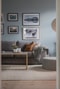 I fil ligger det stora vardagsrummet med samma rena arkitekturlinjer, blonda furugolv och tre slätvita väggar mot en sobert grå fondvägg. Ett fönsterparti med djup nisch vetter mot entrésidans grönska. En öppning leder tillbaka ut i entréhallen.