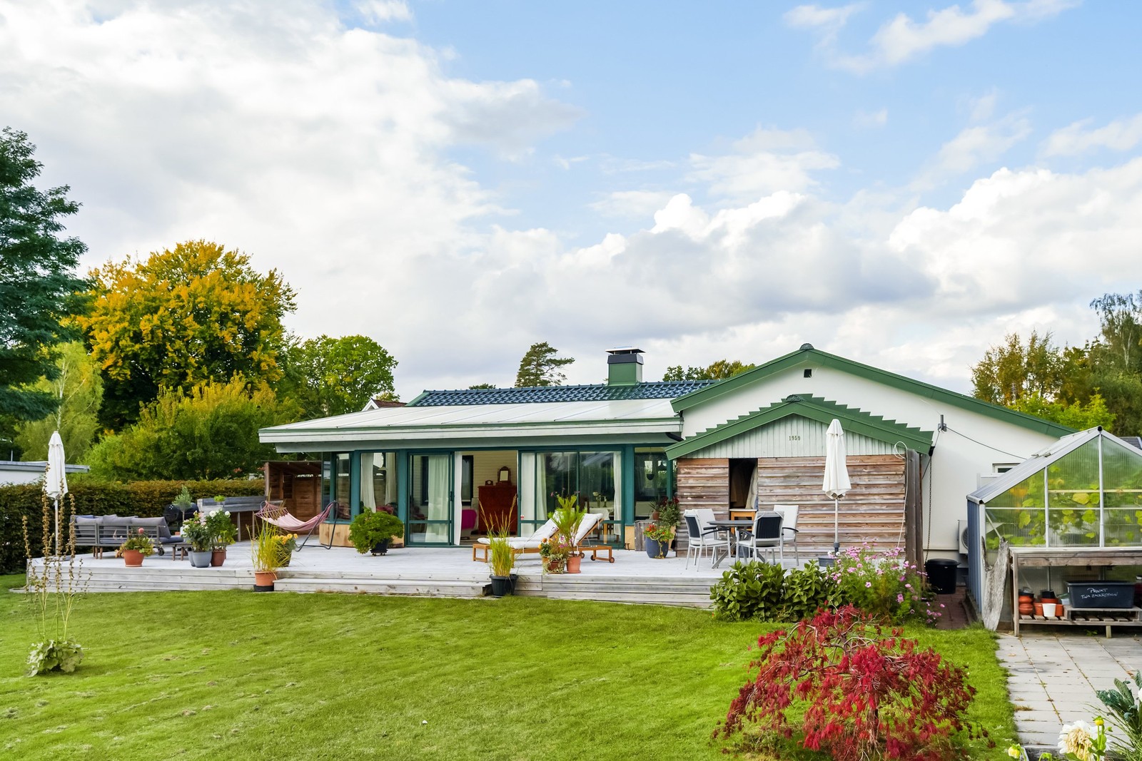 Trädgården är en insynsskyddad grön oas med prydlig köksträdgård, växthus och ett stort trädäck som bjuder in till lata sommardagar och trivsamma middagar under bar himmel. Det uppvärmda och delvis isolerade uterummet blir snabbt en favoritplats, ett extra rum att njuta av nästan året runt. De stora glaspartierna suddar ut gränsen mellan inne och ute och släpper in ljuset och grönskan från trädgården.