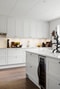 Köket från Marbodal har vita luckor, kyl och frys i fullhöjd är rostfria från Electrolux. En generös köksö med både förvaring, vinkyl samt sittyta rymmer många vänner och gör matlagningen härligt social. Vitt kakel på väggen och bänkskiva i vit stenkomposit med grå ådring, spots i taket. Här finns också plats för stort matbord där många ryms utan att trängas, det här är verkligen ett kök man vill vistas i!
