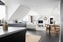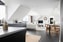 Badrummet är helkaklat i beige toner, duschdörrar i glas och även här charmigt snedtak. Kommod i modernt svart.