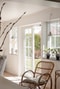 I bortre delen av köket är en matplats som idag används som lounge, på bägge sidor är dubbeldörrar i glas med spröjs som leder ut dels till husets framsida samt till husets baksida där vi har en stor stensatt uteplats under ett pergolatak. Här binds även den skifferplattorna ihop med trädäcket från poolområdet.
