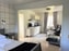I andra delen av rummet finns en ljusgrå bäddsoffa med divan, en grå fåtölj med fotpall, soffbord i svart marmor och en byrå. Fin golvlampa i samma stil som sänglamporna. Samma fondtapet som i sovrummet ramar in fint.