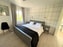 På ena sidan finns sovrummet med en härlig dubbelsäng med mörkt grå klädd sänggavel, två sängbord och fina sänglampor i retrostil. På väggen sitter en diskret och klassiskt mönstrad tapet med rutor i ljusa färger. Två inbyggda garderober och en byrå med tv på väggen ovanför får också plats.