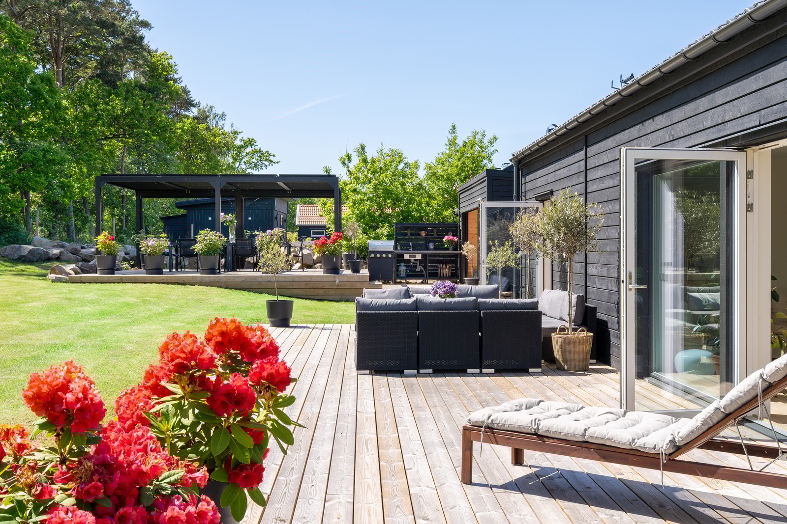 Vackert anlagd och privat trädgårdstomt med flertalet sammanhängande uteplatser, exklusiv pergola med lameller, platsbyggt utekök och gästhus.